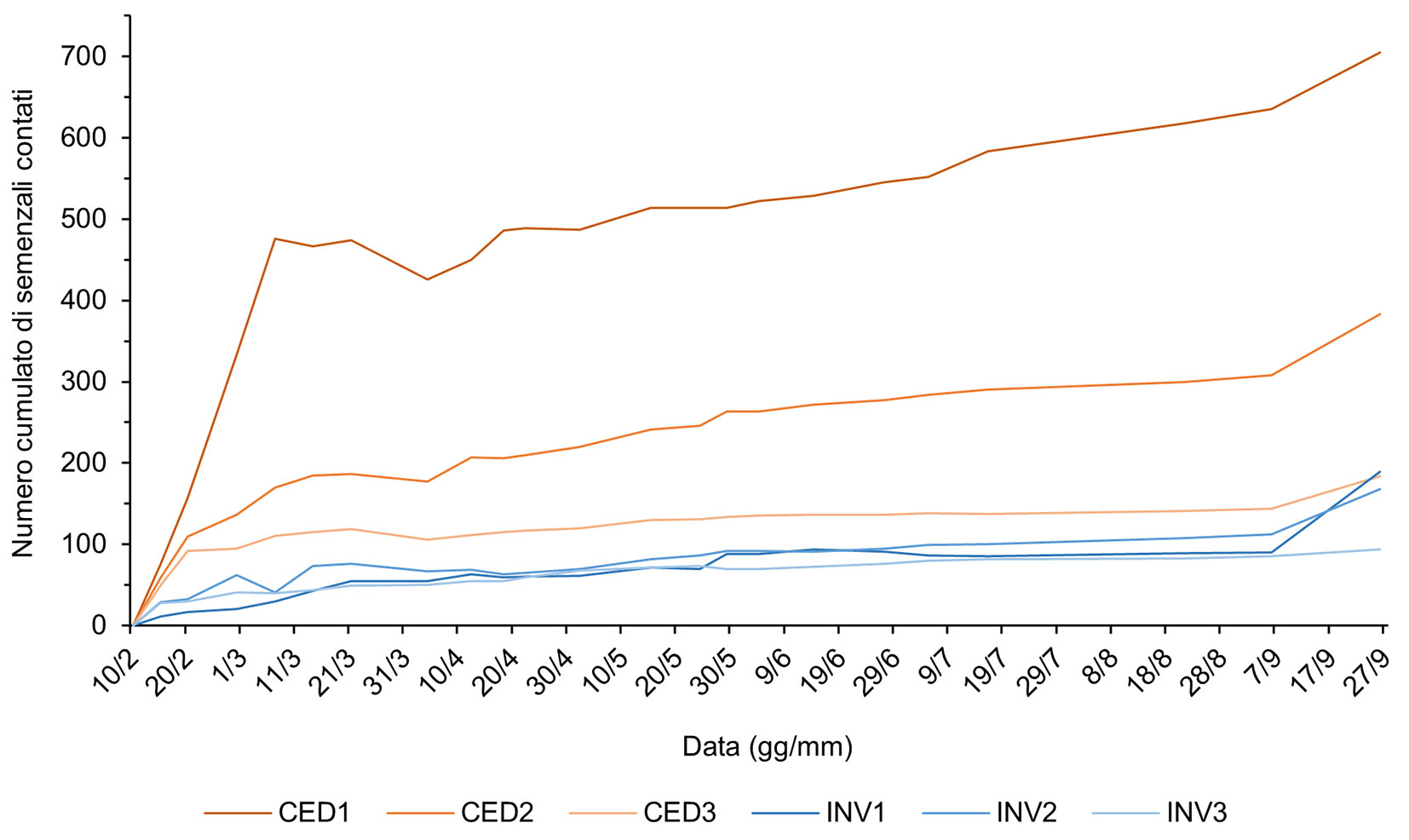 Fig. 1 - Curve di germinazione riportanti il numero cumulato di semenzali contati nel corso dell’esperimento in serra per ogni plot (CED: ceduo a regime; INV: ceduo invecchiato).
