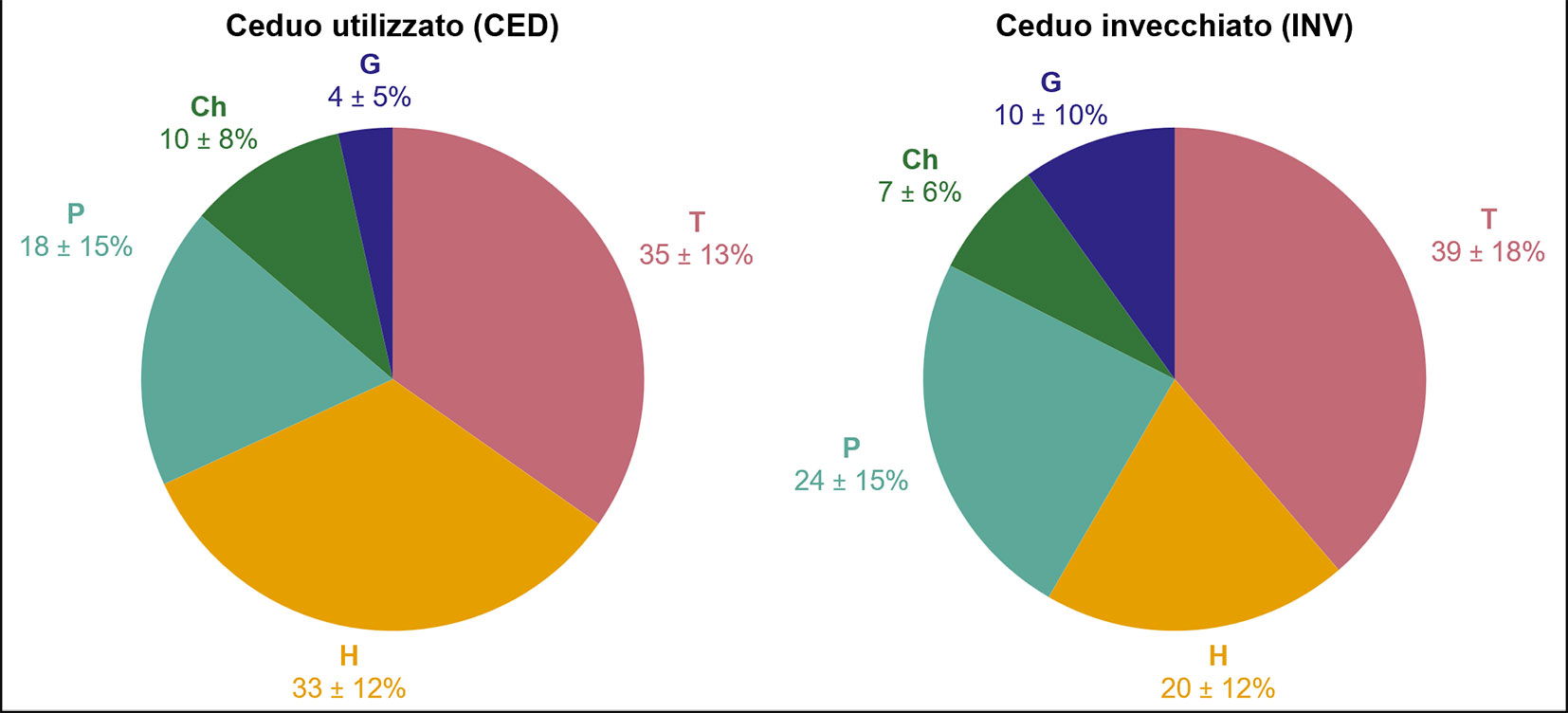 Fig. 2 - Spettri biologici medi riferiti alle due situazioni gestionali, riportanti l’abbondanza media percentuale delle diverse forme biologiche (T = terofite; H = emicriptofite; P = fanerofite e nano-fanerofite; Ch = camefite; G = geofite).