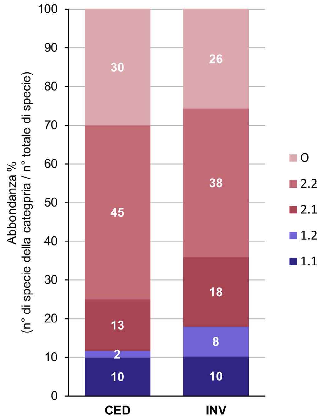 Fig. 3 - Proporzione percentuale di specie appartenenti ai vari gruppi di affinità forestale ([30]) per le due forme di governo. Le categorie 1.1 e 1.2 indicano le specialiste forestali, mentre le categorie 2.1 e 2.2 le generaliste (1.1 = specie nemorali; 1.2 = specie dei margini e delle aperture; 2.1 = specie che possono essere trovate sia in bosco che negli spazi aperti; 2.2 = specie legate specialmente a spazi aperti, ma che possono essere trovate anche in foresta; O = specie di spazi aperti)