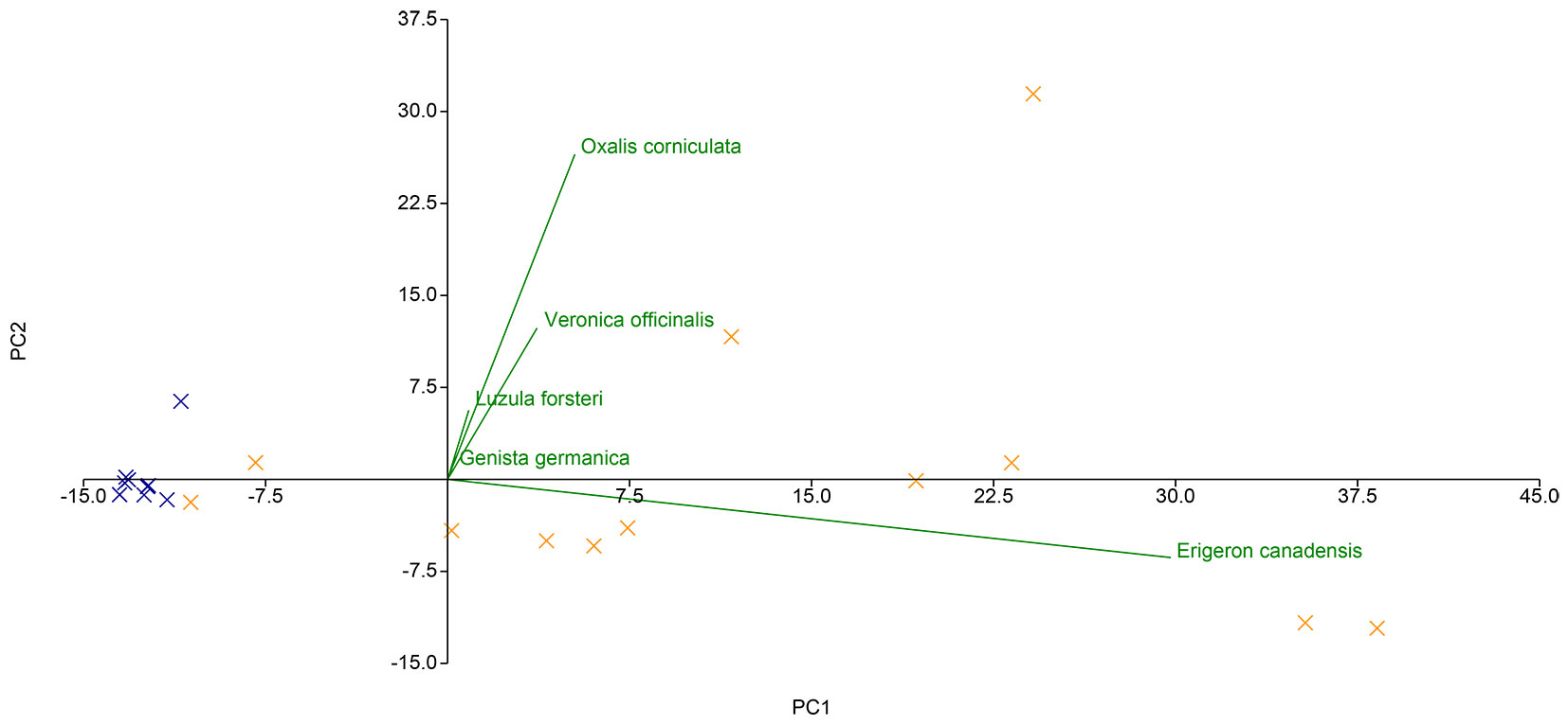Fig. 4 - Diagramma a dispersione biplot della PCA svolta sulla matrice di abbondanza delle seed bank, ridotta e al netto del quadrato QC1_Q4 (Croci arancioni = seed bank del ceduo utilizzato; Croci blu = campioni di comunità del ceduo invecchiato). La matrice di abbondanza ridotta è stata ottenuta rimuovendo dalla matrice di abbondanza originale tutte le specie con coefficiente di correlazione < 0.6 per entrambe le componenti principali.