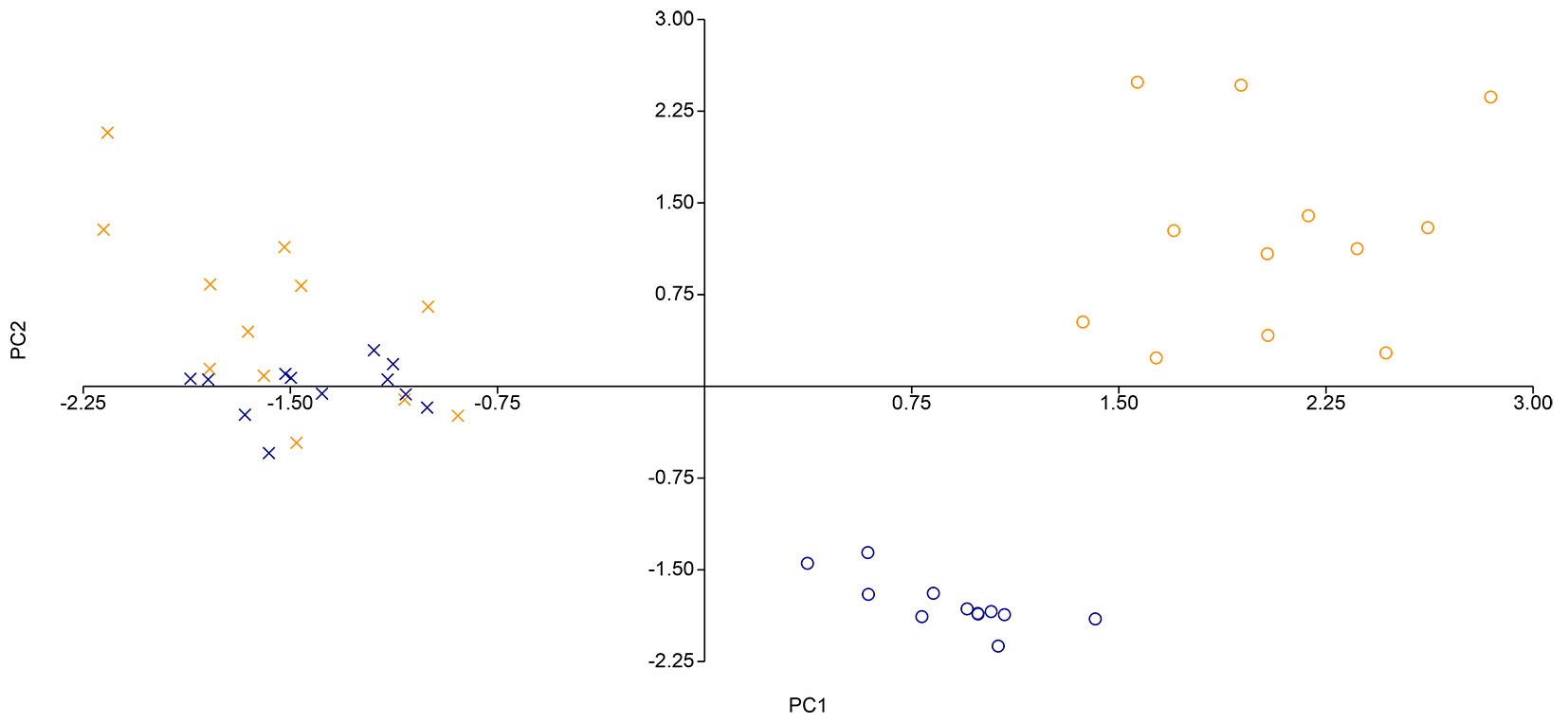 Fig. 5 - Scattergram PCA ottenuto con il dato di presenza/assenza delle specie rilevate per quadrato nella seed bank (Croci arancioni = seed bank del ceduo utilizzato; Croci blu = seed bank del ceduo invecchiato) e a livello di vegetazione realizzata dello strato erbaceo (Cerchi arancioni = vegetazione realizzata nel ceduo utilizzato; Cerchi blu = vegetazione realizzata nel ceduo invecchiato).
